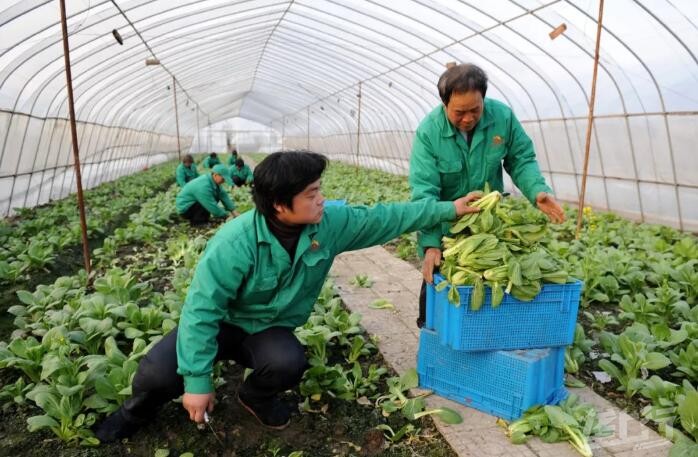 2008年2月19日,一菜农在蔬菜基地大棚内采摘蔬菜。在冰雪灾害期间遭到破坏的大棚修缮完毕,为当地居民的正常生活提供了有力保障。