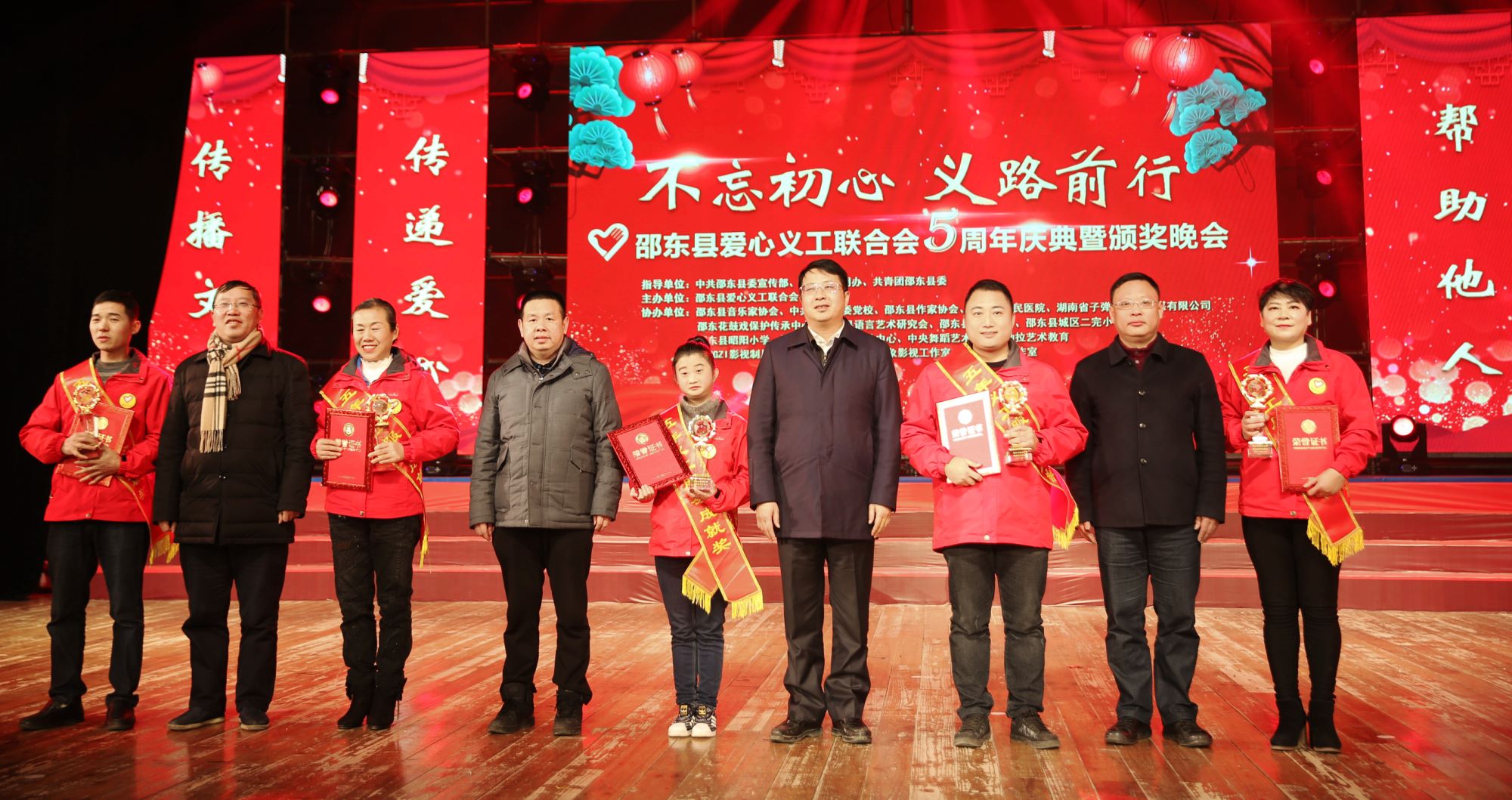 邵东时刻讯(唐冉 刘昭云 李向东)1月26日晚上,邵东县爱心义工联合会举办“不忘初心、义路前行”5周年庆典暨颁奖晚会,回顾五年来所取得的成绩,为朱春花等10名2017年度“十佳义工”、杨卫红等5名获得“五年义工服务成就奖”的爱心义工颁奖。