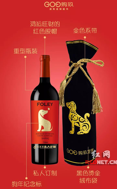 而一些酒商也结合“生肖酒”的热潮,推出定制版的红酒“生肖酒”。比如购玖酒类连锁也推出了狗年生肖酒:采用FoLey福莱西拉干红葡萄酒,可以精刻名字,一瓶只对一人,还有狗年纪念标加上黑色烫金绒布袋,非常的喜庆和有仪式感。不过购玖酒类连锁的相关负责人表示,这款酒只用来提升品牌价值,给客户带来对新一年符合时下稀缺性的“生活态度”和倡导的“生活方式”,并未正式对外销售,而是采取赠送的方式为客户提供尊享服务。