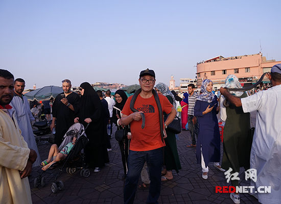 马拉喀什的库图比亚清真寺建于11世纪,这里,朝向圣城麦加方向的17道柱廊等设施,因为1775年里斯本大地震毁于一旦,眼下,被谢绝进入参观的我们游客,只能远远地站在清真寺外,与高高的宣礼塔“相对无语”了。倒是附近的一处坪地,有标准的田径比赛场那么宽大,名曰“不眠广场”,才仅黄昏时刻,游人如织,熙熙攘攘。广场中,一个又一个游人的圆形的“池”,“池”的中央是正在表演驯蛇、杂技,还有魔术的民间艺人。在这,虽没有能聆听到“阿拉伯神灯”的故事,人缝中挤进的我,一时兴之所至,“古稀”的人了啊,让一艺人将一条长长的青蛇挂到了脖子上......