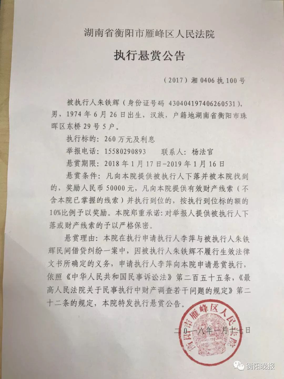 悬赏条件:凡向本院提供被执行人下落并被本院找到的,奖励人民币50000元,凡向本院提供有效财产线索(不含本院已掌握的线索)并执行到位,按执行到位标的额的10%予以奖励。本院郑重承诺:对举报人提供被执行人下落或财产线索的予以严格保密。