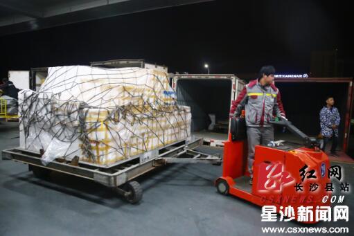 2月8日21时25分,经过3小时长途飞行,8吨来自越南的海鲜空降长沙,工作人员正在装车。均为盛磊摄