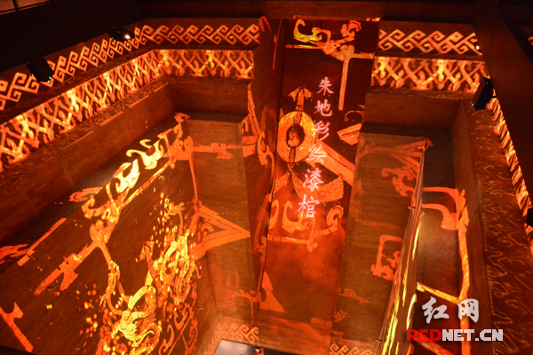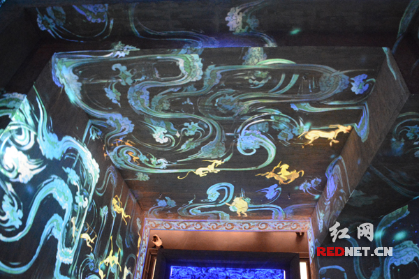 这段梦幻影像以辛追墓墓坑和棺椁为背景板,将装殓辛追夫人的棺椁以及T形帛画上的画面用动画的形式投影到墓坑表面,并配合楚文化中极具神秘色彩的背景音乐,勾勒出了汉代人想象中的宇宙空间和他们对永生之梦的追求,声光电的完美配合让整个展览空间极富视听冲击力。
