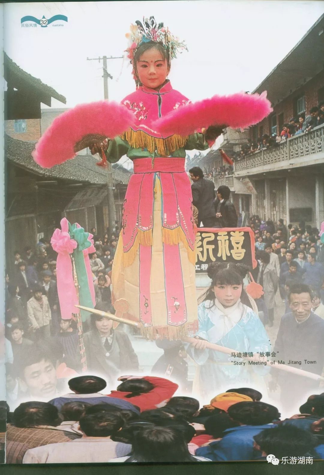 在正月十五闹元宵时,马迹塘一带的民间艺人,常运用独特的手法和技巧,按照剧情的特写场景,把两名儿童装扮成剧中人,照戏剧艺术造型,一高一低地站在一个一平方米的木台上,由四名男子汉抬着进行表演,在鼓乐和鞭炮声中,杂在闹元宵的人流里,游街过市,缓缓行进,远看像仙女从天而降,飘拂而来,近看则是出精彩的折子戏,加上小演员传神的眼睛,出色的表演,引得看热闹的观众,如痴如醉,非要追着跑着,看个明白,弄清究竟。这就是“马迹塘故事”。