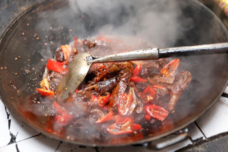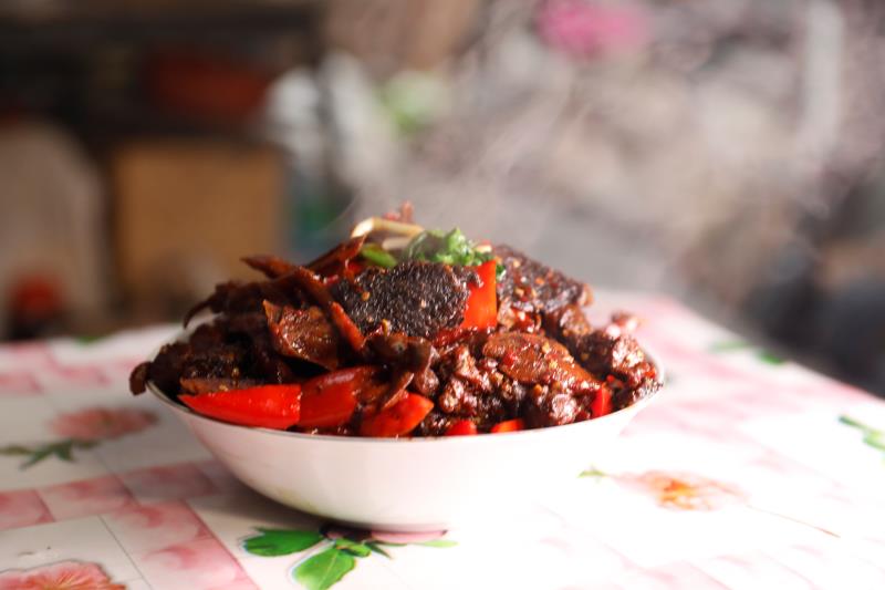 刘建兴的儿子从事摄影工作,平日难得回家。所以,每次他们回来,他就会炒上一份血粑鸭。“炒制这道菜还必须用到的洪江甜酱和血粑,使整套菜包含酥脆与糯软两种口感,才能有家的味道。”刘建兴边炒边说。