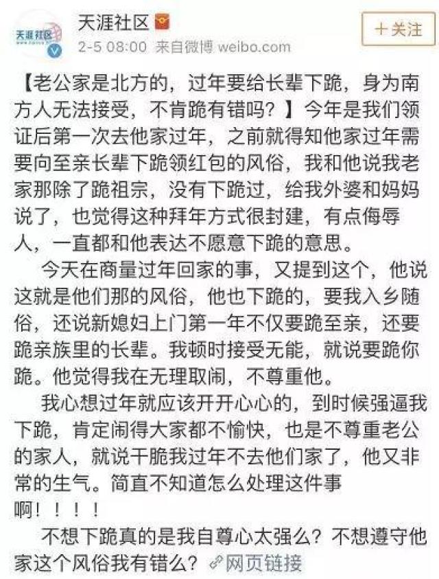 最近网友就为了这个事情吵翻天了。一个来自南方的新媳妇,要和北方人老公回老家过年。身未动,就已经得知那边要向至亲长辈下跪领红包,甚至新媳妇上门第一年连亲族里的其他长辈也要跪。