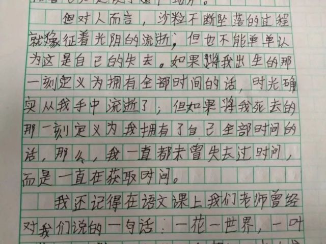 据说,这已经不是小邵第一次思考时间的意义的,之前他还写过一篇周记《用心听见时间》: