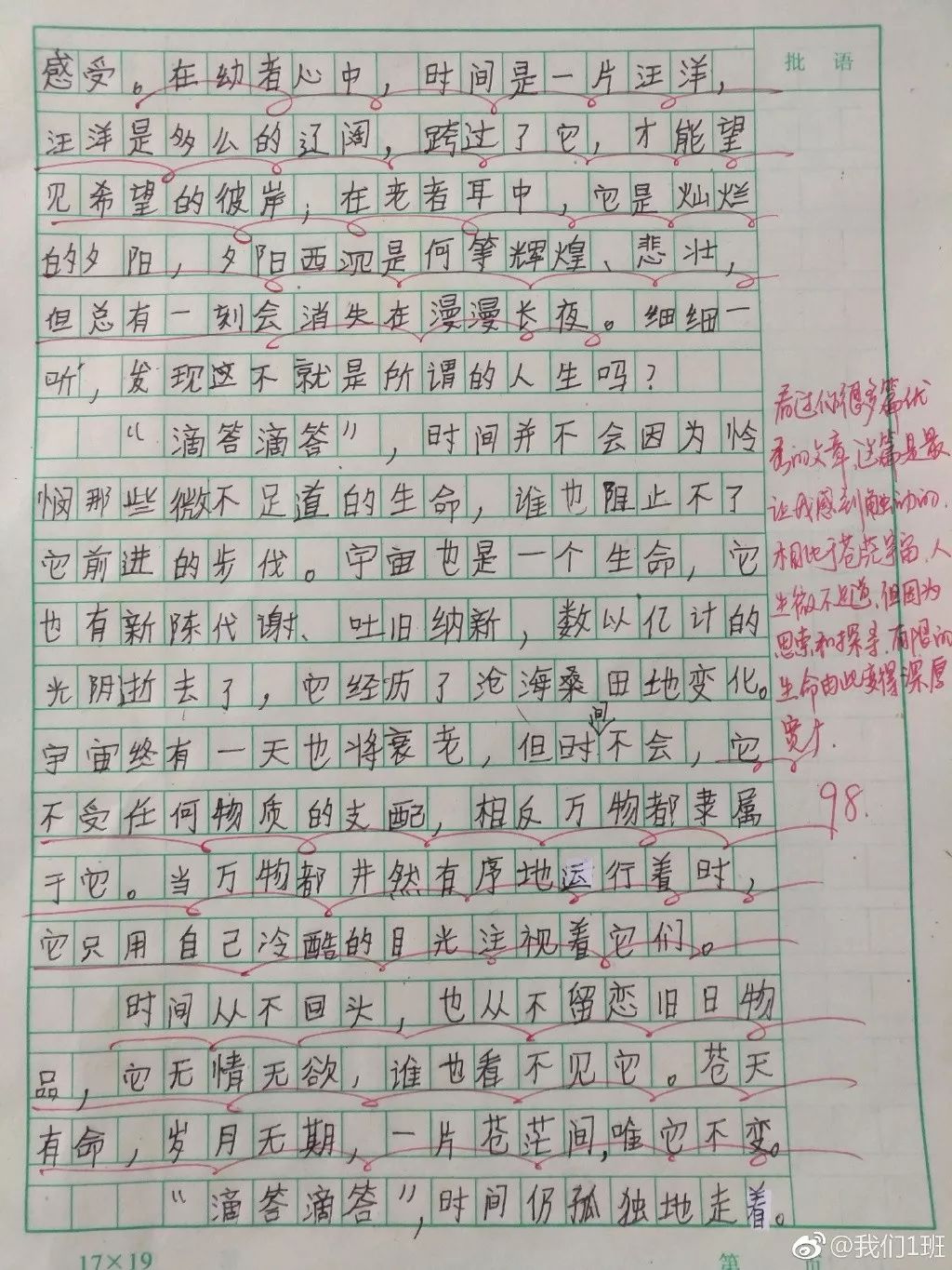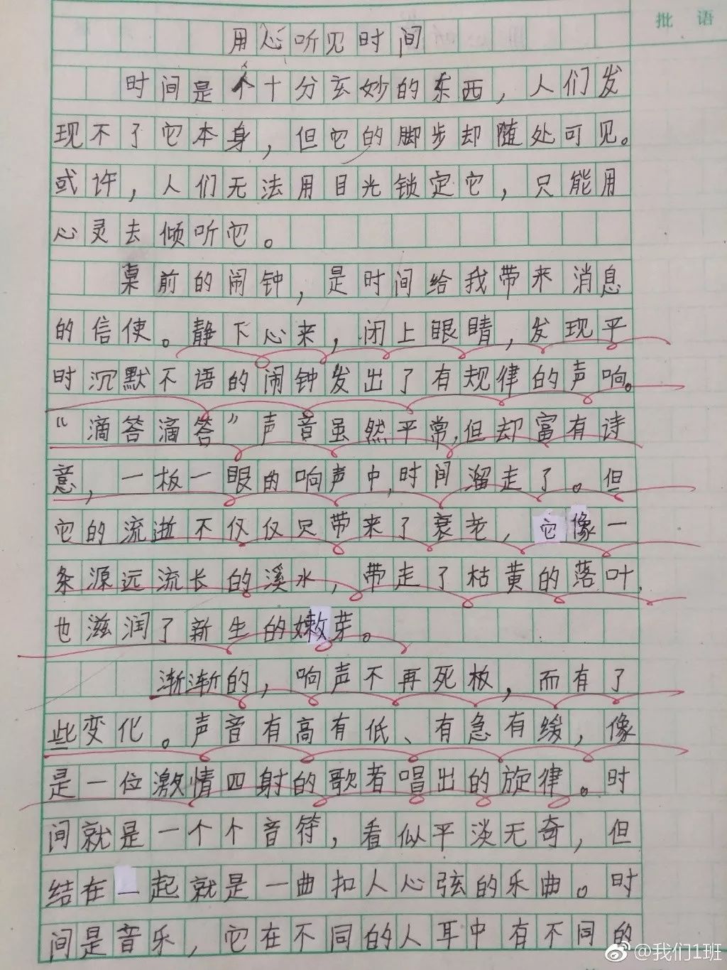 据说,这已经不是小邵第一次思考时间的意义的,之前他还写过一篇周记《用心听见时间》: