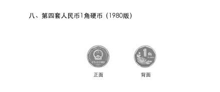 (八)第四套人民币1角硬币。其材质为铝镁合金,正面图案为国徽、国名、汉语拼音国名、年号,背面图案为菊花、面额。
