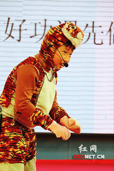 3月27日下午,长沙市天心区红卫小学的多媒体室里,孩子们表演由《魔术老虎》改编的童话剧。