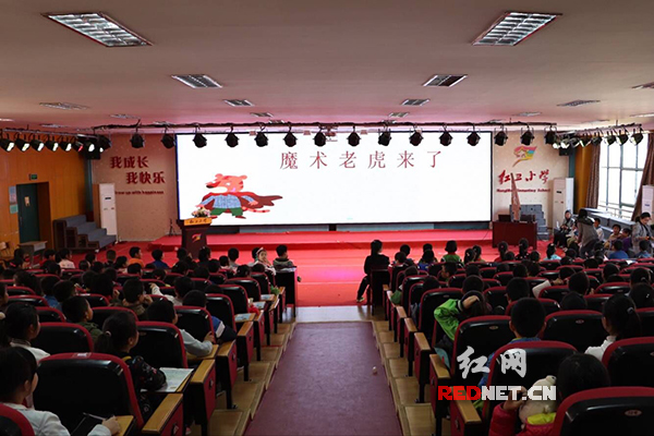 红网时刻3月27日讯(通讯员 陈琪)“老虎跑进学校来了!”3月27日下午,长沙市天心区红卫小学的礼堂里热闹非凡,师生都在热议着一只神奇的老虎:它没有牙齿,可变大变小,神通广大,不欺负人,还喜欢交朋友……它是“魔术老虎”,中国孩子自己的童话明星!为迎接“世界读书日”的到来,红卫小学启动了“百校倡议——爱你红卫·放飞梦想阅读活动”,邀请著名儿童文学作家、又称“魔术老虎”爸爸的谢乐军等参加活动。