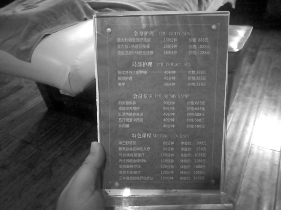 3月24日晚,记者以消费者身份在龙帅SPA馆体验,房内桌上摆放的项目价位表。