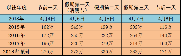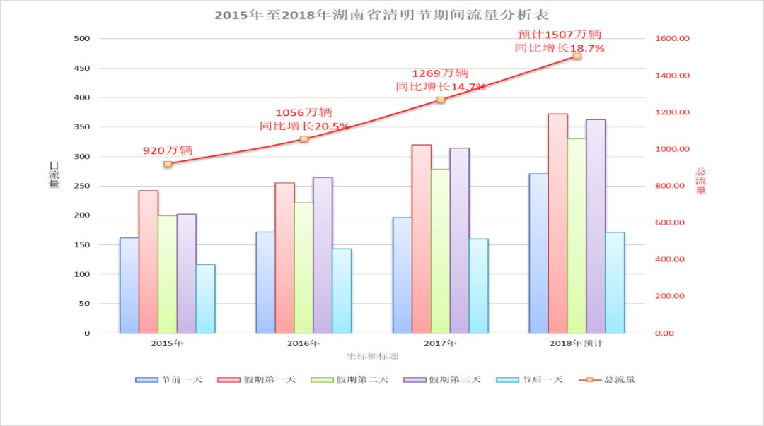 2018年清明“小长假”放假时间为4月5日(星期四)至7日(星期六)。根据研判,假日期间群众扫墓、祭祀活动以及中短途自驾车出游将明显增加,全省高速公路路网车流量将持续高位运行,预计总流量为1066万台次,较去年增长约16.8%,日均流量将达到正常日均流量的2至2.5倍。清明假期,高速公路对7座以下(含7座)小型客车实施免费通行政策,免费时段从4月5日0时起至7日24时止。清明祭扫和踏青旅游活动激增,为保障清明节期间全省高速安全畅通,高警局请广大驾驶人合理选择出行时间、出行线路、出行方式,避开出行高峰和易堵路段,做到平安出行。