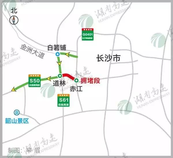 从长沙出发,沿金洲大道西行至S61岳临高速白箬铺收费站,经岳临高速南下在道林枢纽转S50长韶娄西行。