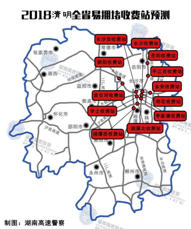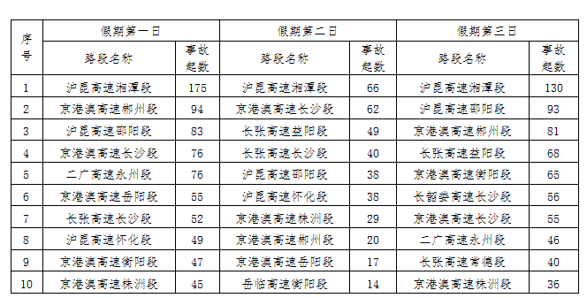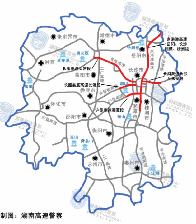 G5513长张高速长沙至益阳段,S50长韶娄高速长沙段,G4 京港澳高速岳阳段、长沙段;G60沪昆高速湘潭段、邵阳段;G60沪昆高速与益娄衡高速共线段;G0401长沙绕城高速西南、西北段以及各景区、陵园附近高速路段。
