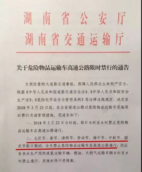 根据省公安厅和省交通运输厅近日联合发布的《关于危险物品运输车高速公路限时禁行的通告》,提醒危险物品运输车辆在清明期间不要在高速公路上通行。