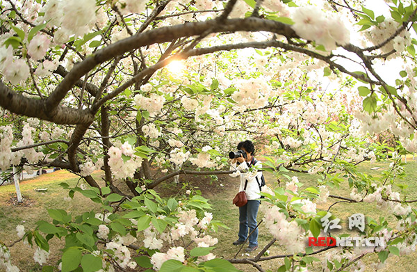 南华大学的一位同学在校园的樱花道上拍摄樱花。