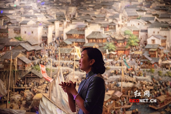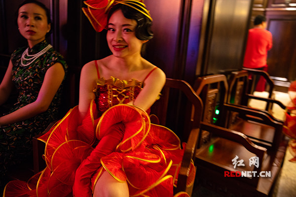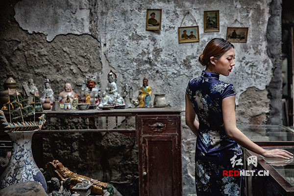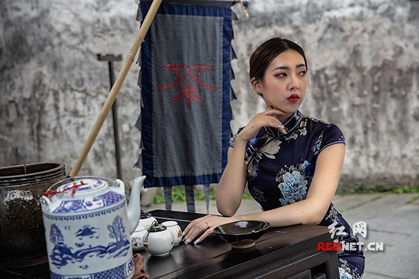 身着旗袍的女工作人员双手握在一起看着前方,墙上的洪江古商城的油画仿佛将我们带入到那个年代。
