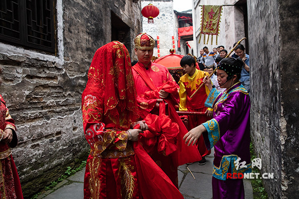 做了“新郎”的游客,眼睛盯着带着头盖的临时出演的“新娘”,迫切地想一睹芳容。