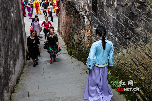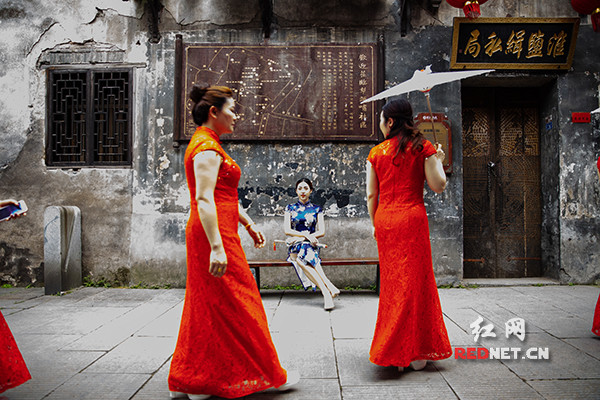 在洪江古商城中穿梭,城中巷内,青石板路和码头蜿蜒迂回、高深莫测。墙角一色的青瓦灰墙,飞檐翘角,雕龙画凤;街头茶坐摊、小食摊、各色手工艺摊贩街边叫卖;嫁人的花轿敲着锣在街头穿过;1915会馆外报童挥舞着报纸喊着今天的新闻;身上挎着卖烟箱的女童正在叫卖,好不热闹。推门走进一户人家,青砖粉墙,雕梁画栋,古香古色。大片明清至民国时代的寺庙、墟场、驿站、衙门、钱庄、银行、书院、学堂、会馆、作坊、洋行、客栈、报社……身着旗袍、马褂的你,此刻也成了这座城中的一道风景,一切仿佛穿越回民国。