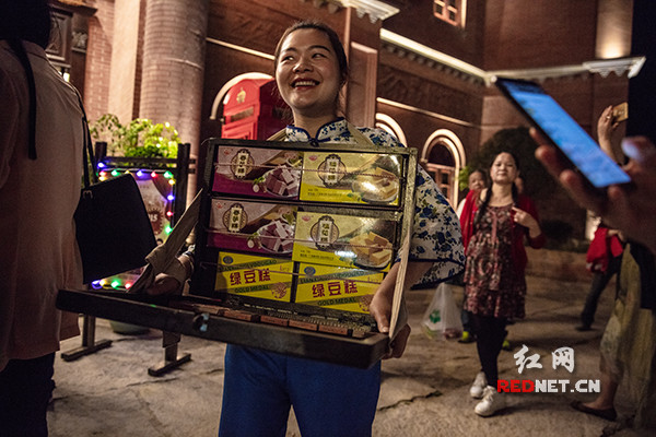 卖各色传统小吃的姑娘挎着小食箱在会馆外叫卖。