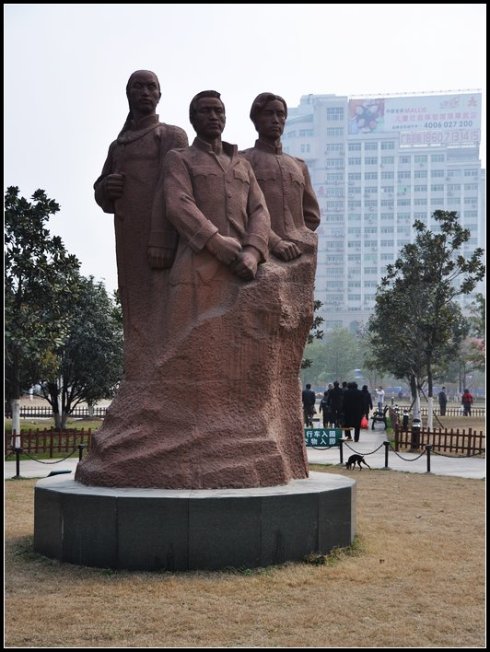 1911年11月9日,是彭楚藩、刘复基、杨宏胜三烈士就义的“月忌日”,蒋翊武作为鄂军政府特派代表到武昌紫阳路,主持隆重的追悼大会,宣布日后建三烈士碑为首义遗址。图为武昌市的三烈士纪念塑像。