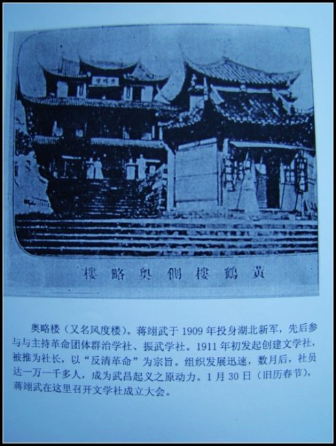 1911年1月30日(农历春节),蒋翊武鉴于清廷对振武学社的严密监视,约集詹大悲、刘复基、杨载雄等在黄鹤楼侧的奥略楼举行会议,宣告文学社成立,蒋翊武被推举为社长。图为会议地址。