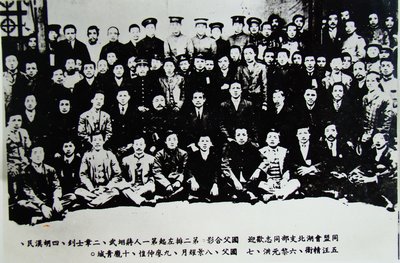 1912年4月,孙中山考察武昌,与湖北革命党人合影,蒋翊武(2排左1)、孙中山(2排左7)。