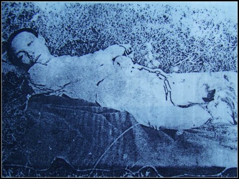 蒋翊武遭到袁世凯、黎元洪的迫害,在桂林被捕。1913年9月9日下午4时为国殉难,时年不足29岁。图为蒋翊武就义后,躺卧在红地毯上的身影。照片提供:蒋漫征。