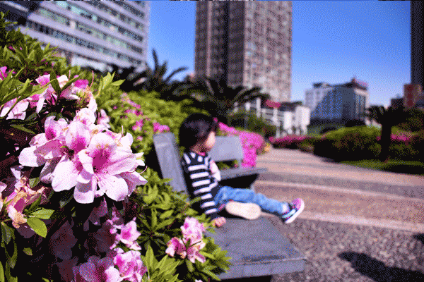 芙蓉广场杜鹃盛放,正是孩童玩乐好时节。
