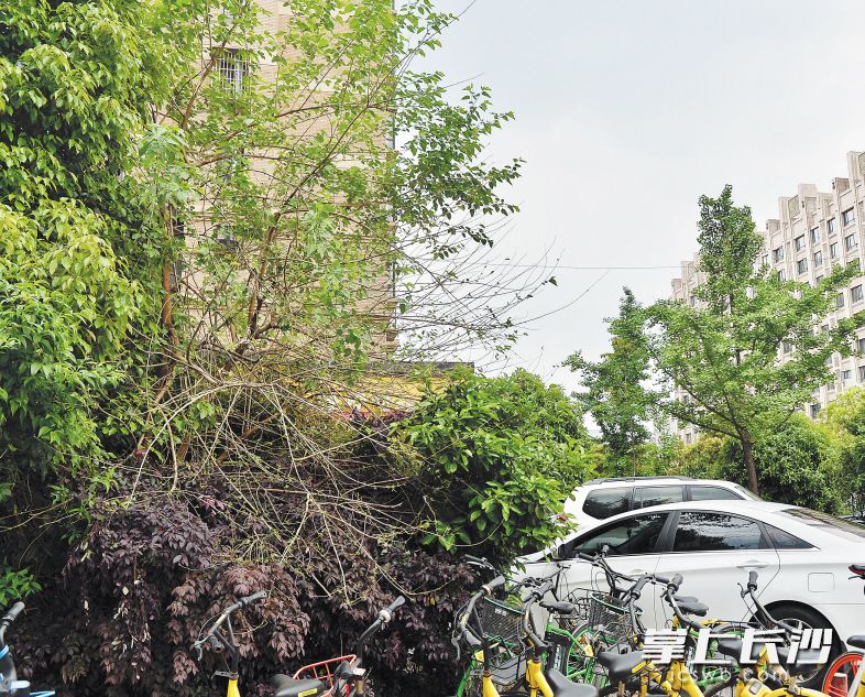 在雨花区古曲路石坝路口旁,这棵桑树一大半树枝被摘光了树叶。 长沙晚报记者 邹麟 摄