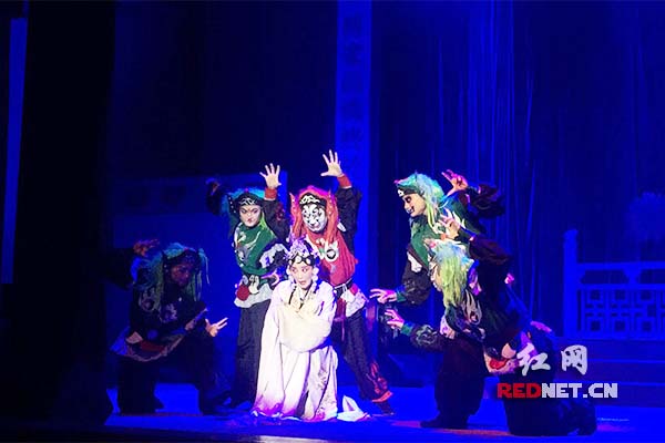 祁剧《目连救母》剧照——小鬼花园索命。