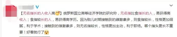 “看手相”在我国民间流传甚广,在当今互联网时代,“手相”似乎被赋予了新的内涵。近期网传:无名指比食指长的人易获得高收入,食指较长的人易获得高学历。