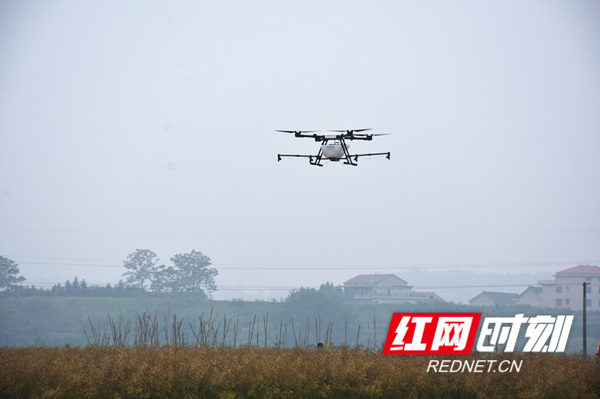 无人植保机起飞,贴近油菜花的地里上空来回有序飞行喷药。