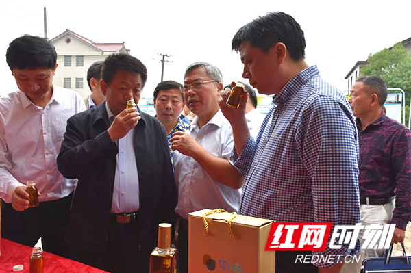 中国农业科学院副院长、中国工程院院士王汉中,省农业机械管理局党组书记、局长王罗方、娄底市人民政府副市长梁立坚等观摩了解菜籽油的品质、榨油机的出油率及榨油原理。