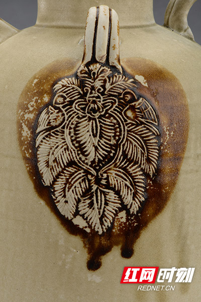长沙铜官窑第一个开创模印贴花,即用陶泥模印出花纹后,粘贴在瓷壶的系纽或流下,再施以彩釉。此次展示中,公众可以看到模印贴花壶,这是长沙窑外销的代表性产品,运用了模印贴花工艺,贴花的题材如椰枣纹等都是西亚文明的元素,具有浓郁的西亚风格。