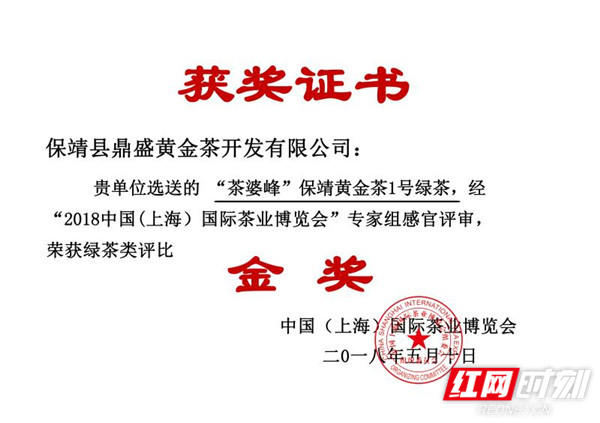 红网时刻湘西5月15日讯(记者 彭晗 通讯员 彭振 易果)“一两黄金一两茶”,素有“中国最好绿茶”之称的保靖黄金茶当之无愧。5月10日至13日,第十五届中国(上海)国际茶叶博览会在上海世博展览馆举行,保靖县派出优秀茶叶企业参展。在本次国际茶叶博览会上,保靖县鼎盛公司和天地和公司所选送的保靖黄金茶绿茶在评比中分获金奖和银奖。