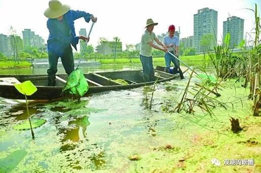 (常德市城区新河水系综合整治如火如荼,图为工人们在清理浮萍)