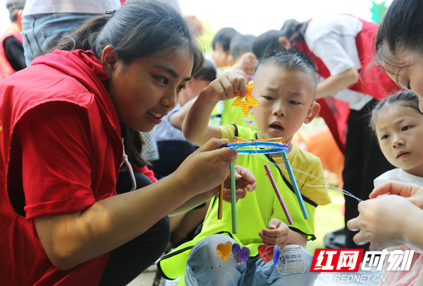 南华大学守望阳光爱心助残志愿者们帮助听障孩子们与妈妈一起制作风铃。