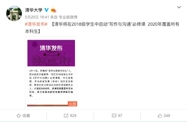 近日,清华校长表示,清华将开设“写作与沟通”必修课。计划到2020年,覆盖所有本科生,并力争面向研究生提供课程和指导。