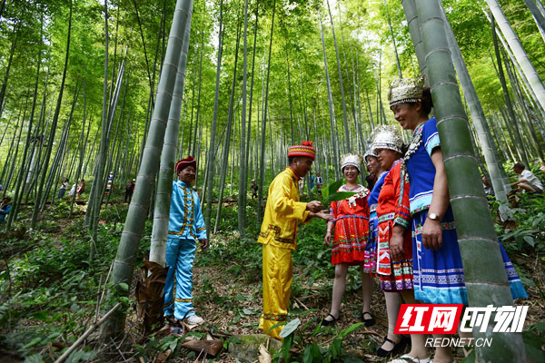 绥宁赤木滩竹海正在进行“花歌喔吙飞竹海”民俗表演。