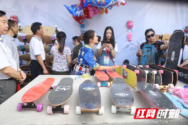湖南丰源体育科技有限公司展示的竹滑板,产品远销美国、加拿大、德国等20多个国家和地区,是第十三届全运会指定产品。