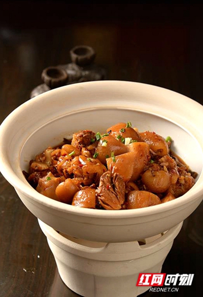 秦始皇率王公大臣及三万虎贲卫士途径齐地。郡守设宴迎之。席间奉上一猪手菜肴,十丈之内有醇香,色泽红润,形态喜人。郡守陈述,此为猪手经多种香料卤汁浸卤,温润养颜。做法繁复,配制精细。秦皇欢喜:小猪手,大有乾坤。后取谐音,定为:秦皇乾坤掌。