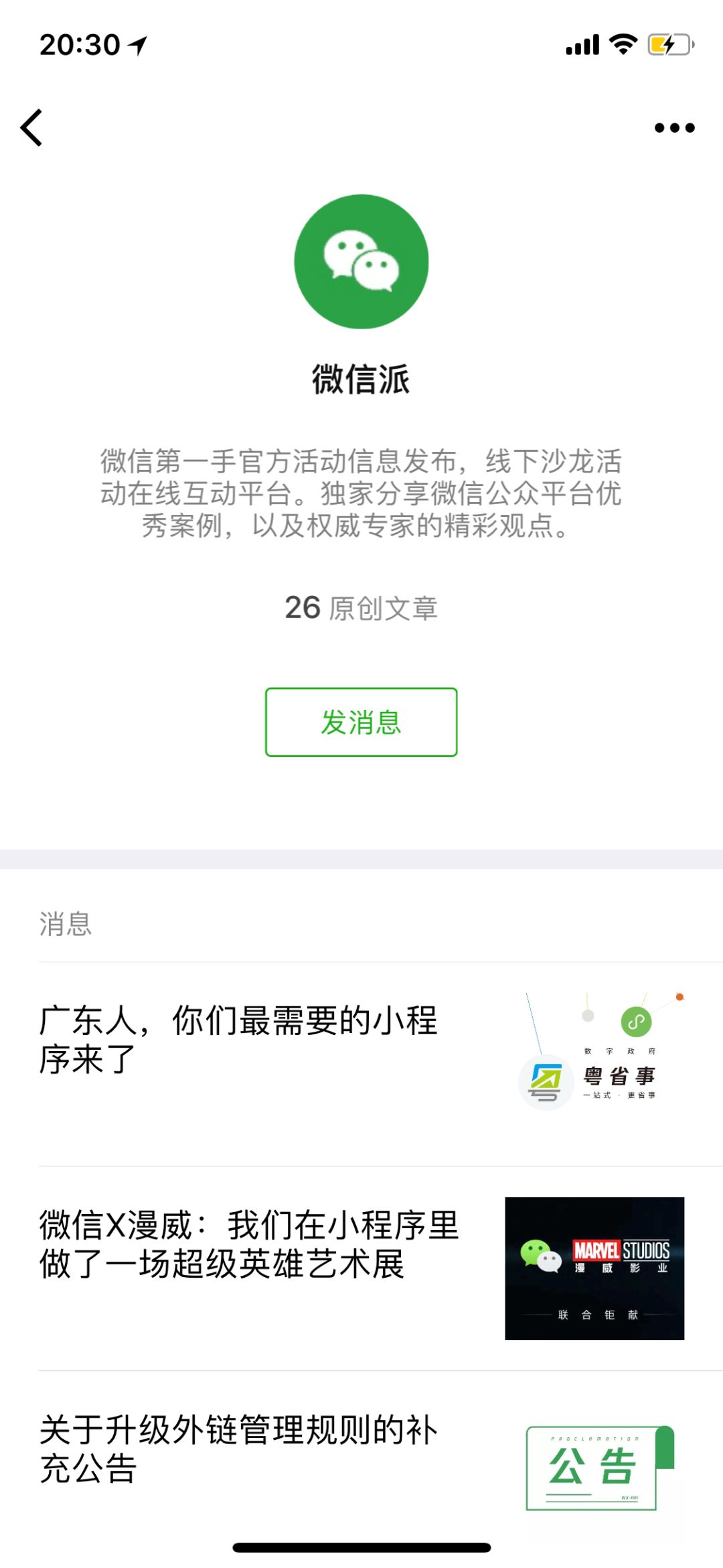 订阅号和服务号的资料介绍页面也有一些变化,分为基本信息区域和内容区域(或服务区域),增加了原创文章篇数,内容区域则展示公众号的3条消息。