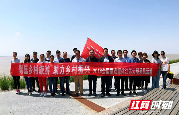 记者们在洪泽湖大堤“醉美三公里”风光带合影留念。