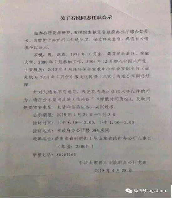 自媒体刊登的这份由中共山东省政府办公厅党组于4月28日发布的公示信息显示,经办公厅党组研究,石悦同志拟任省政府办公厅综合处处长,为增加干部任用工作透明度,接受群众监督,将有关情况予以公示,公示期限为4月29日——5月8日。