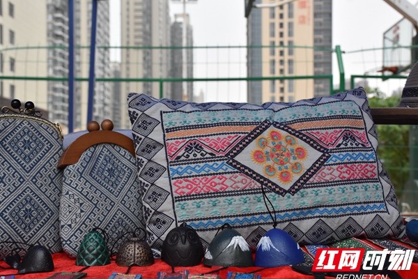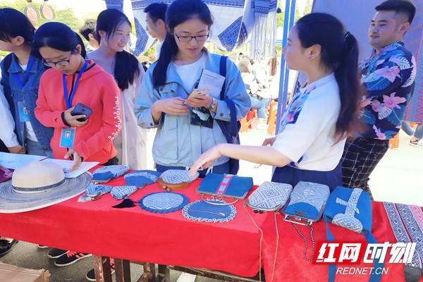 怀化学院侗锦织造技艺研培班文创展上,精美的侗锦饰物吸引了学生驻足观望。