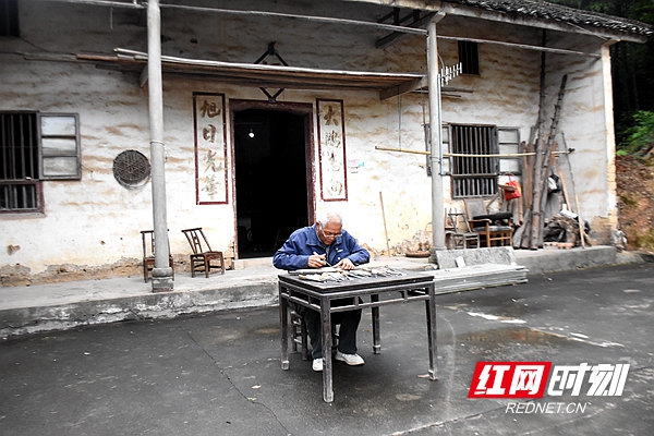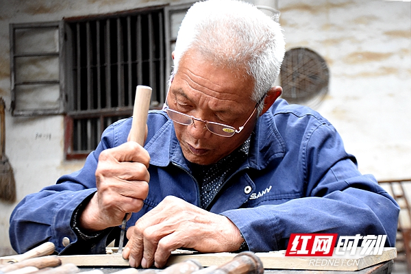 在雨湖区响塘乡的一栋旧式土砖房里,我们再次见到了技术高超的老木匠戴志光。一头银发的他坐在一条小木凳上,戴着一副老花眼镜,右手拿着刻刀,心无旁骛的在进行木刻,时而凝眉审视,时而快速雕琢修补,小心翼翼地刻出人物的轮廓。岁月在他黝黑的皮肤刻下深邃的皱纹。
