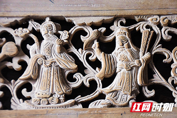 原来,这件山水围屏是1984年湘潭市博物馆成立之时移交过来的,但受展陈条件等因素限制,一直被封存在大木箱子里。湘潭市博物馆也多次尝试请来木匠拼接组装屏风,但都没有成功。直到2015年,工作人员在湘潭仙女山附近,寻访到了年近七旬的老木匠戴志光。在戴志光的巧手修复下,屏风终于重现夕日光彩。从封存到展出,时隔几十年,木雕人物山水围屏终于亮相在世人面前。