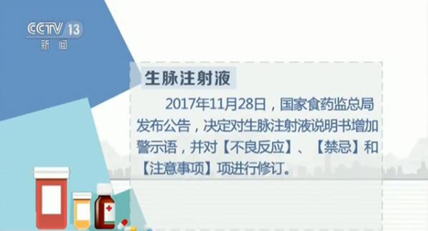 2017年11月28日,国家食药监总局发布公告,决定对生脉注射液说明书增加警示语,并对【不良反应】、【禁忌】和【注意事项】项进行修订。